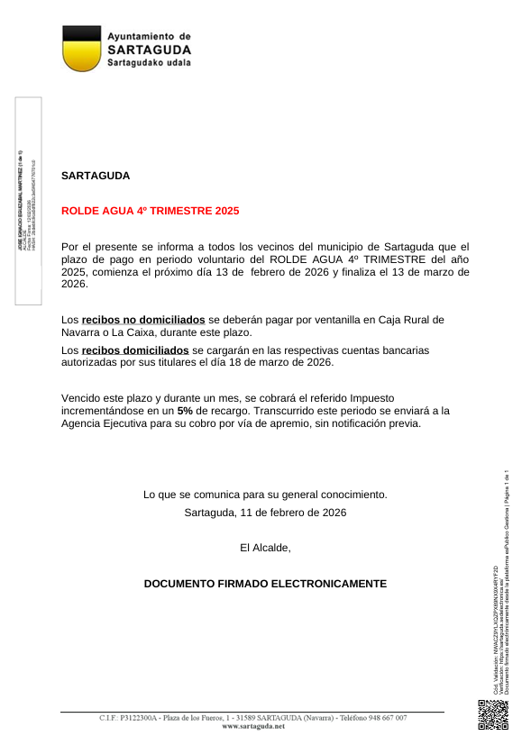 Aviso de Pago del Rolde de Agua – 4º Trimestre 2025