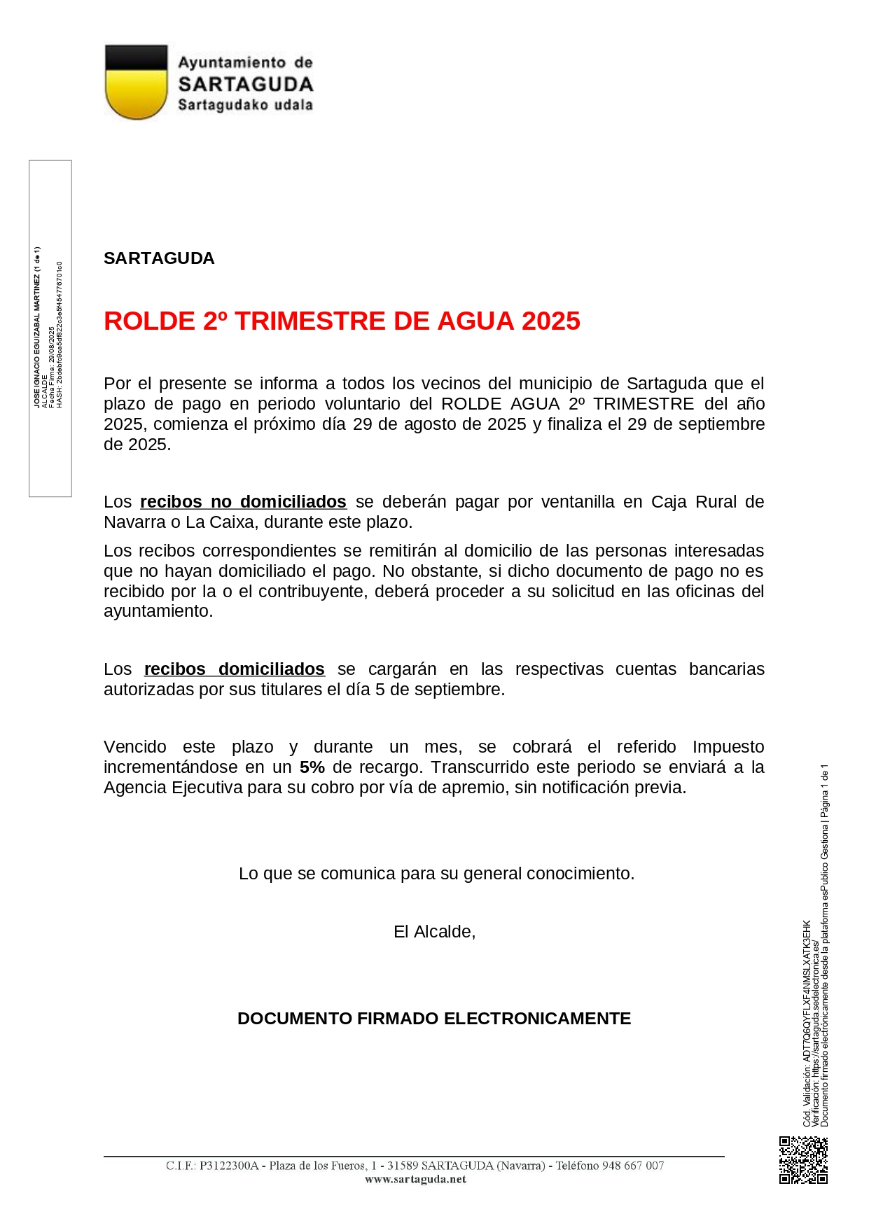 Aviso sobre el Rolde de Agua 2º trimestre 2025 en Sartaguda: pago voluntario del 29 de agosto al 29 de septiembre