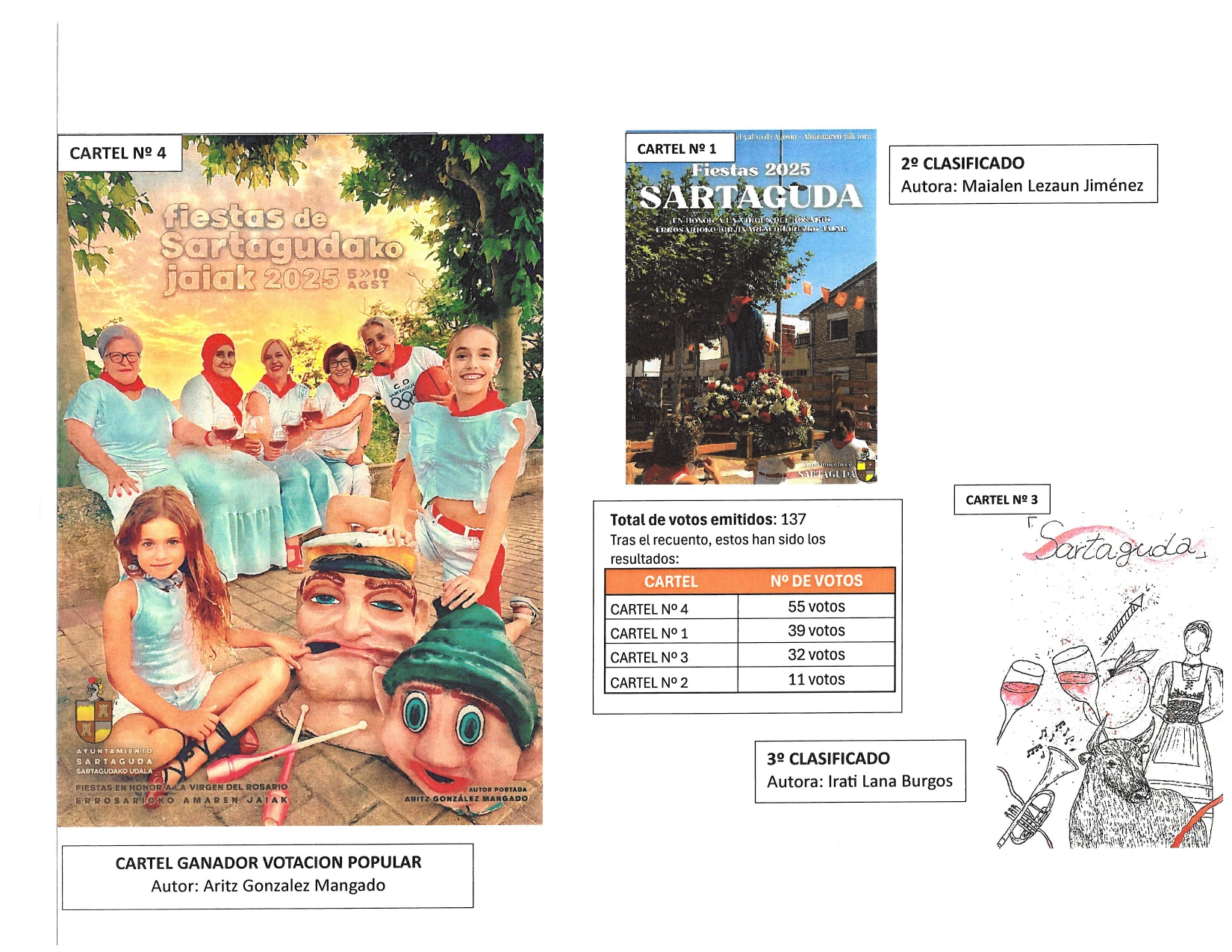 Cartel ganador para las Fiestas de Sartaguda 2025: Aritz González se impone en la votación popular con 55 votos frente a tres finalistas.