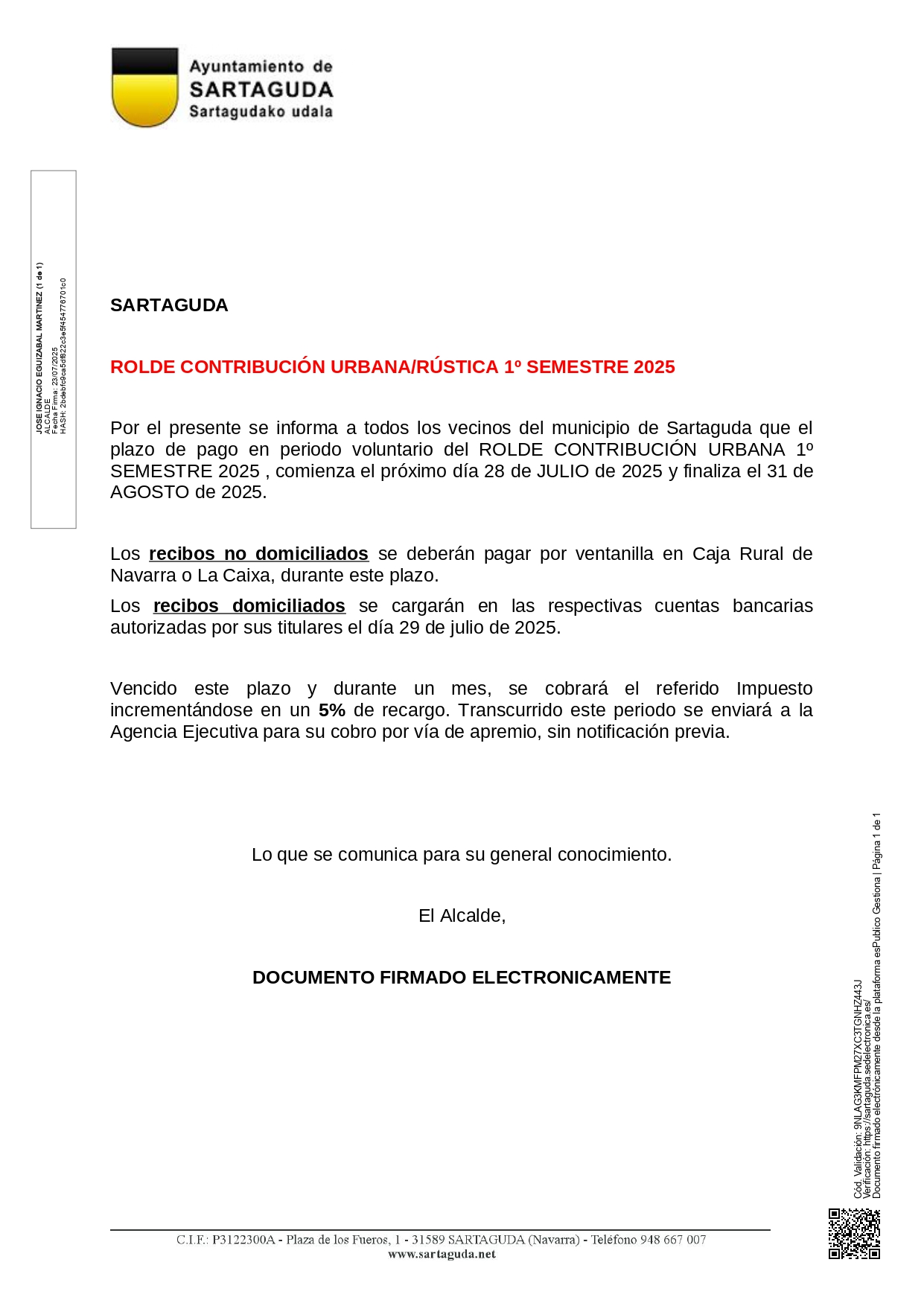 Abierto el plazo del Rolde de Contribución Urbana/Rústica en Sartaguda: del 28 de julio al 31 de agosto de 2025. ¡Evita recargos!