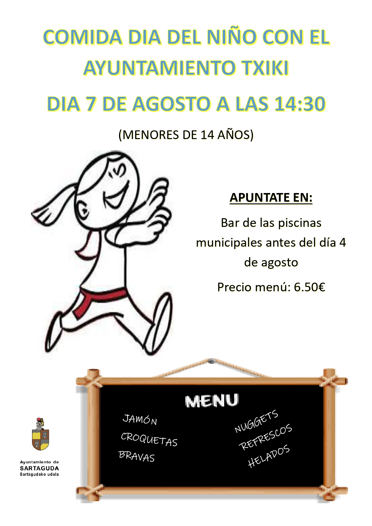 Comida del Día del Niño con el Ayuntamiento Txiki el 7 de agosto a las 14:30. Menú infantil por solo 6,50 €. ¡Apúntate antes del día 4!