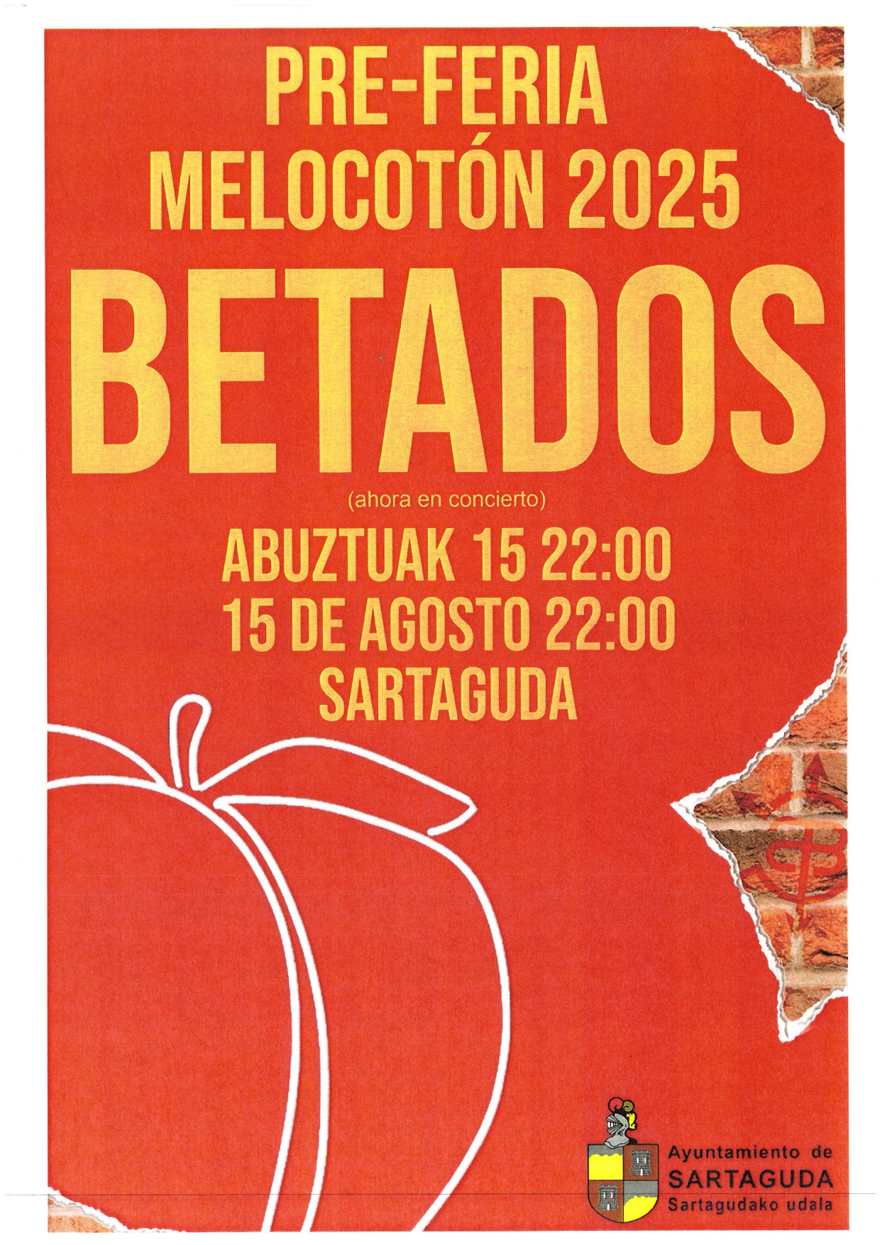 🎶 ¡Concierto de BETADOS en Sartaguda! Vive la Pre-Feria del Melocotón 2025 el 15 de agosto a las 22:00 con música en directo.