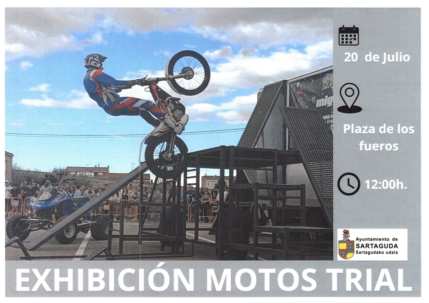 ¡Motores al máximo en Sartaguda! 🏍️ El 20 de julio, gran exhibición de trial en el frontón a las 19:30h. ¡Vive la adrenalina en directo!