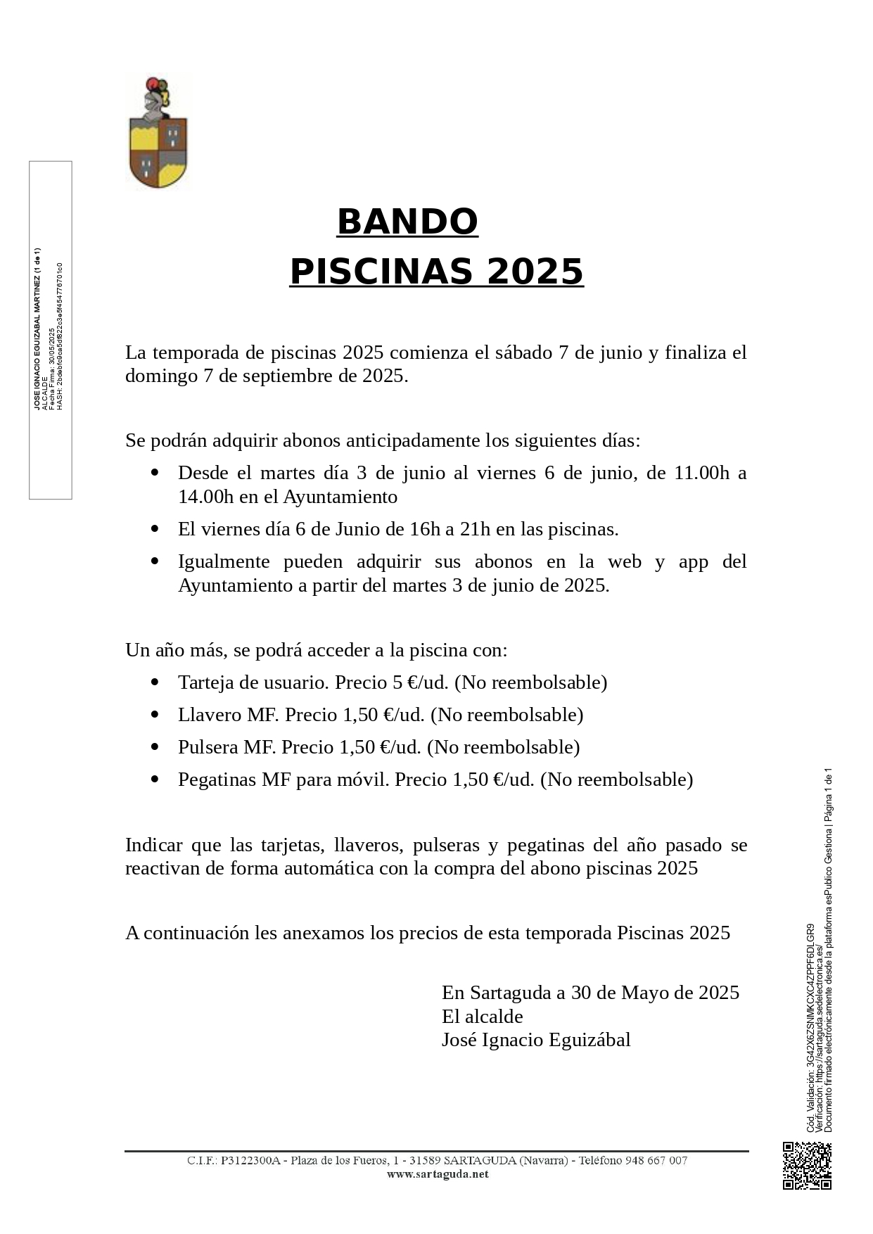 Disfruta la temporada de piscinas 2025 en Sartaguda del 7 de junio al 7 de septiembre. Adquiere tu abono online o en taquilla.