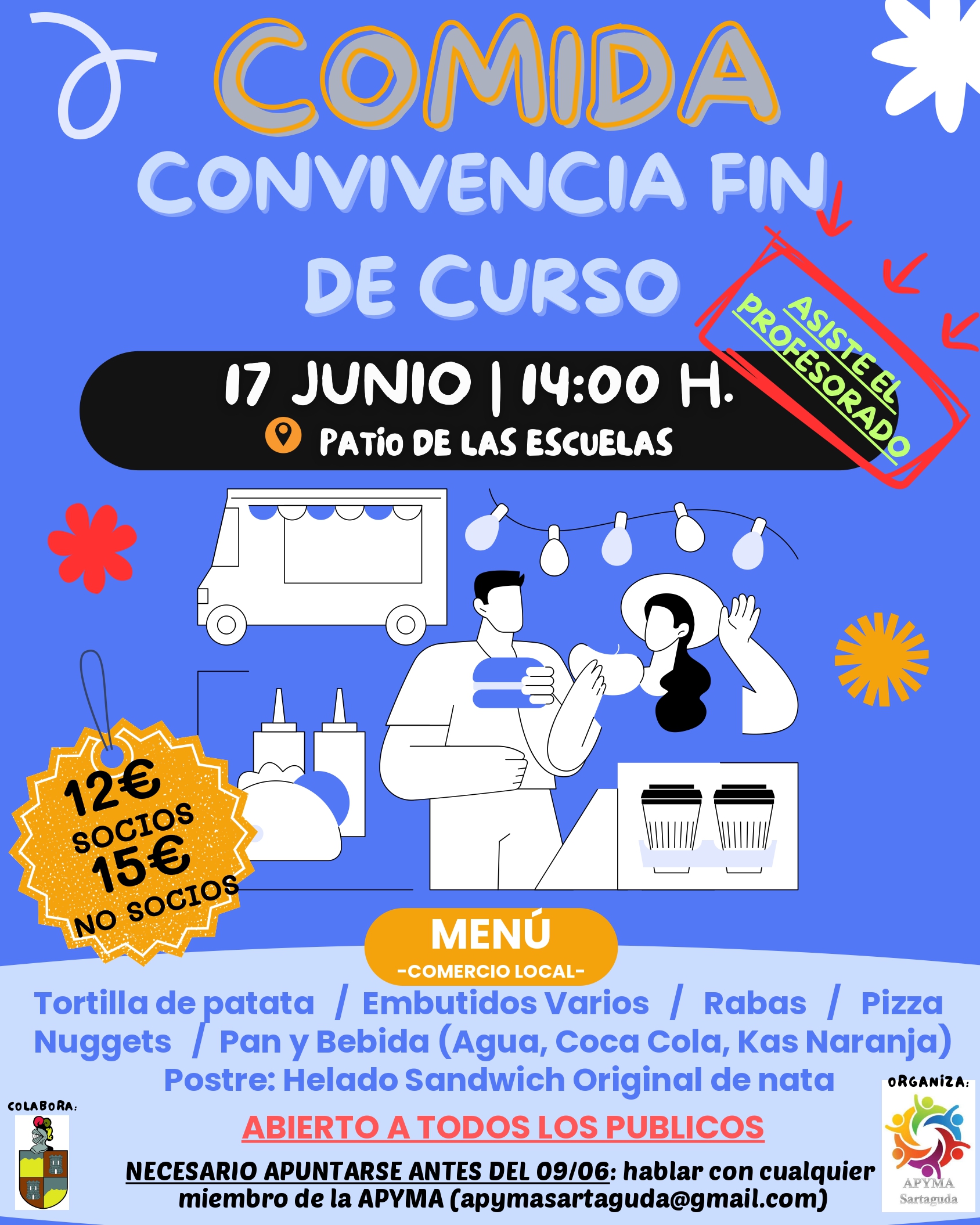 Disfruta de una comida popular con tortilla, embutidos, rabas y más. ¡Evento abierto a todos para celebrar el fin de curso!