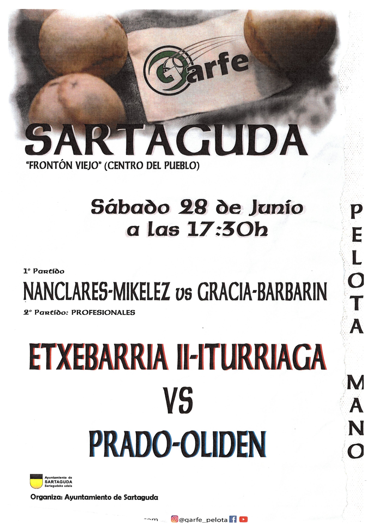 Gran tarde de pelota mano en Sartaguda el sábado 28 de junio a las 17:30. Dos partidos, ambiente familiar y entrada gratuita.