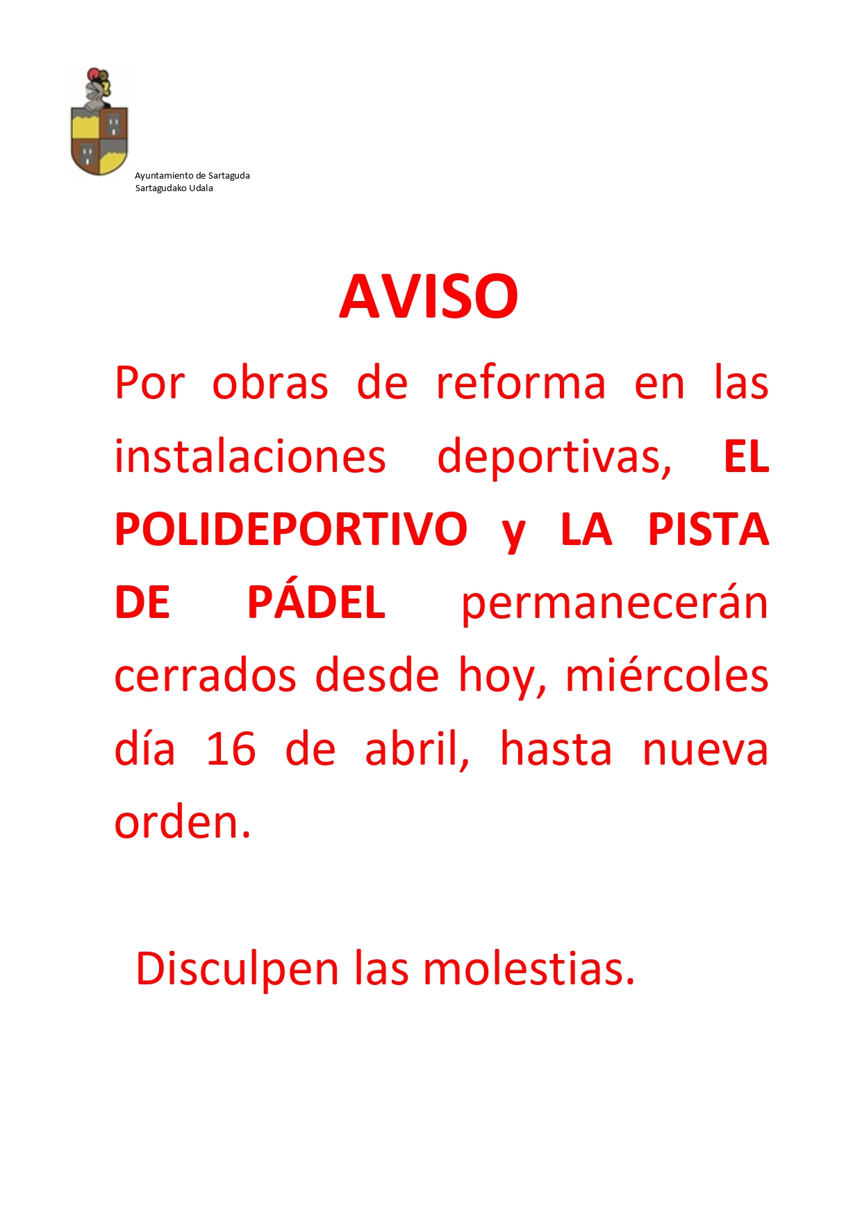 Por reformas, el polideportivo y la pista de pádel de Sartaguda permanecerán cerrados desde el 16 de abril.