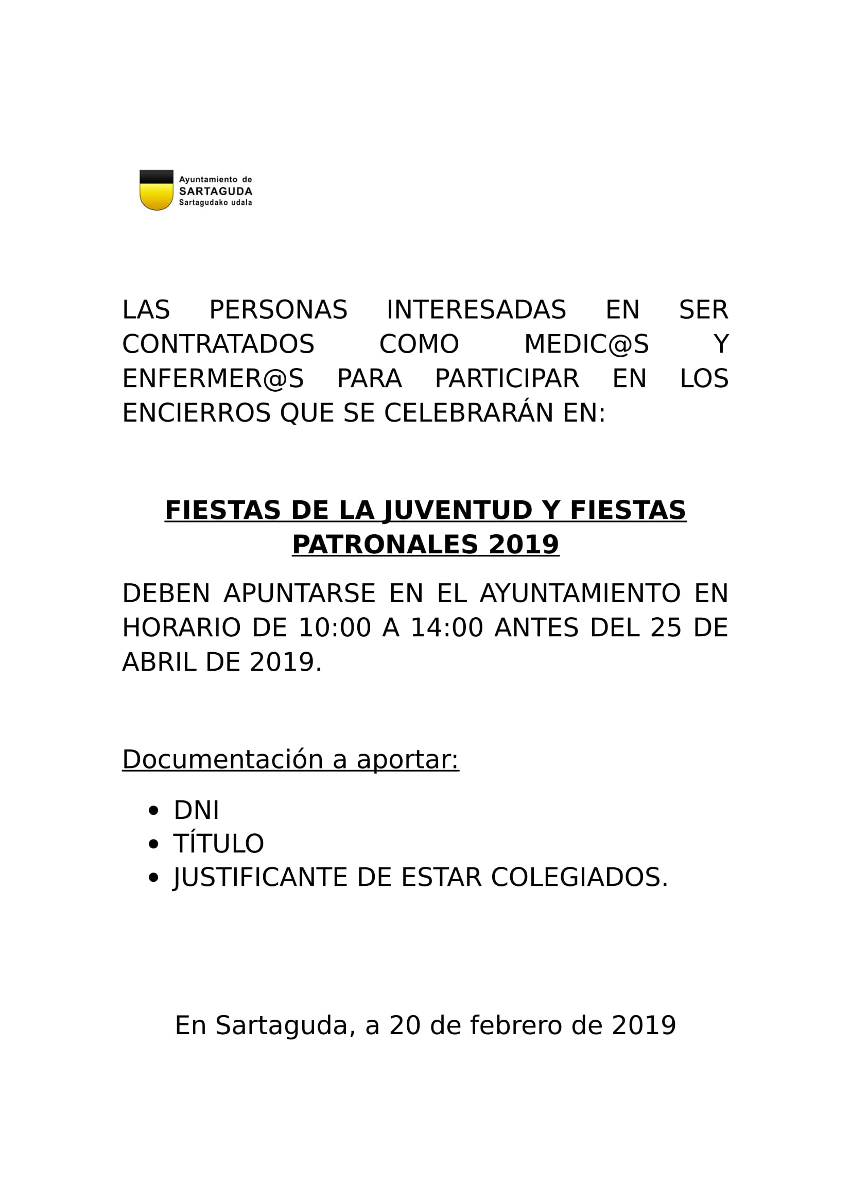 PERSONAS INTERESADAS EN SER CONTRATADOS COMO MEDIC@S Y ENFERMER@S PARA PARTICIPAR EN LOS ENCIERROS QUE SE CELEBRARÁN EN: FIESTAS DE LA JUVENTUD Y FIESTAS PATRONALES