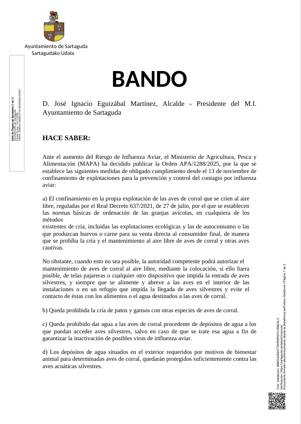 El Ayuntamiento de Sartaguda informa de que, ante el incremento del riesgo de Influenza Aviar, el Ministerio de Agricultura