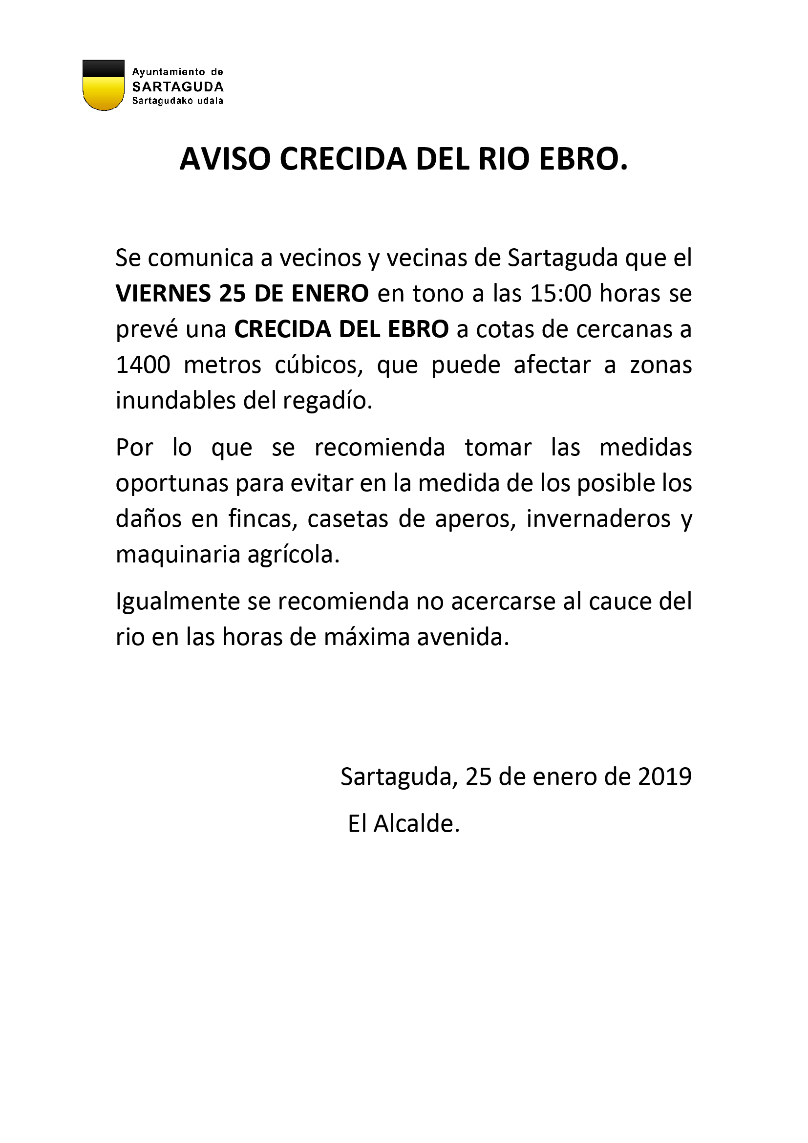 Se comunica a vecinos y vecinas de Sartaguda que el VIERNES 25 DE ENERO en tono a las 15:00 horas se prevé una CRECIDA DEL EBRO
