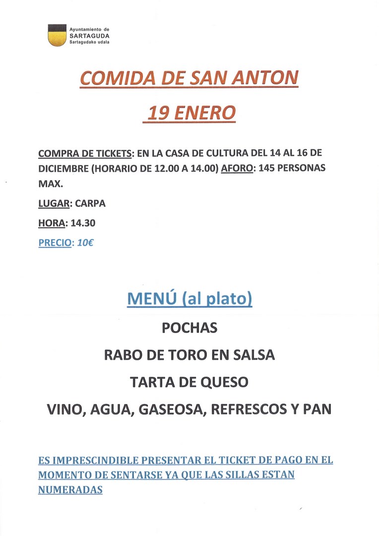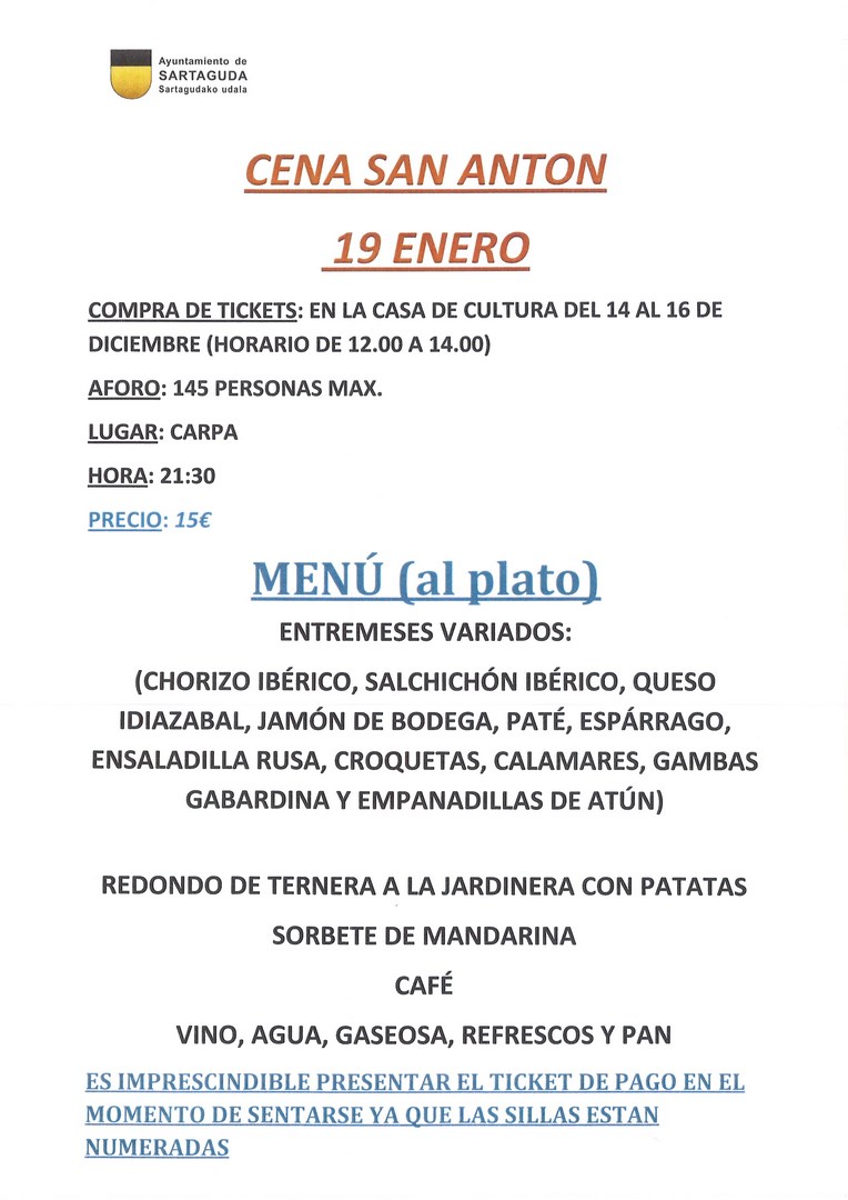 Cena de San Anton en la Carpa el día 19 de Enero a las 21:30