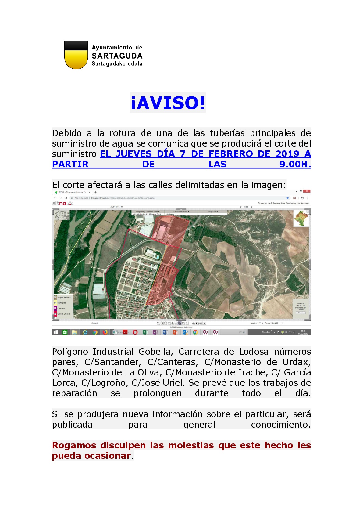 Debido a la rotura de una de las tuberías principales de suministro de agua se comunica que se producirá el corte del suministro EL JUEVES DÍA 7 DE FEBRERO DE 2019 A PARTIR DE LAS 9.00H.