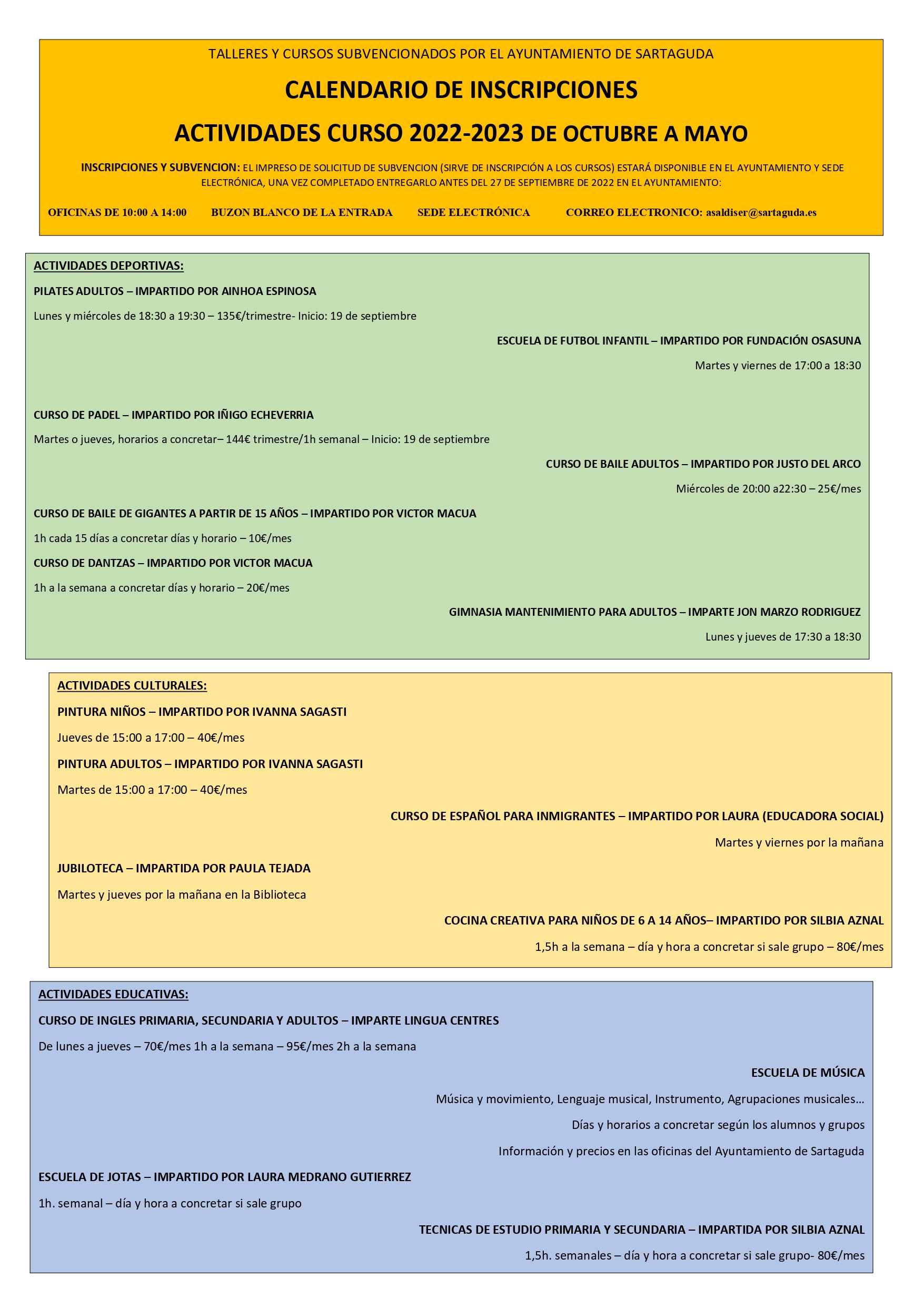 Calendario de inscripciones de las actividades para el curso 2022/2023 de Octubre a Mayo. Actividades deportivas, culturales y educativas.
