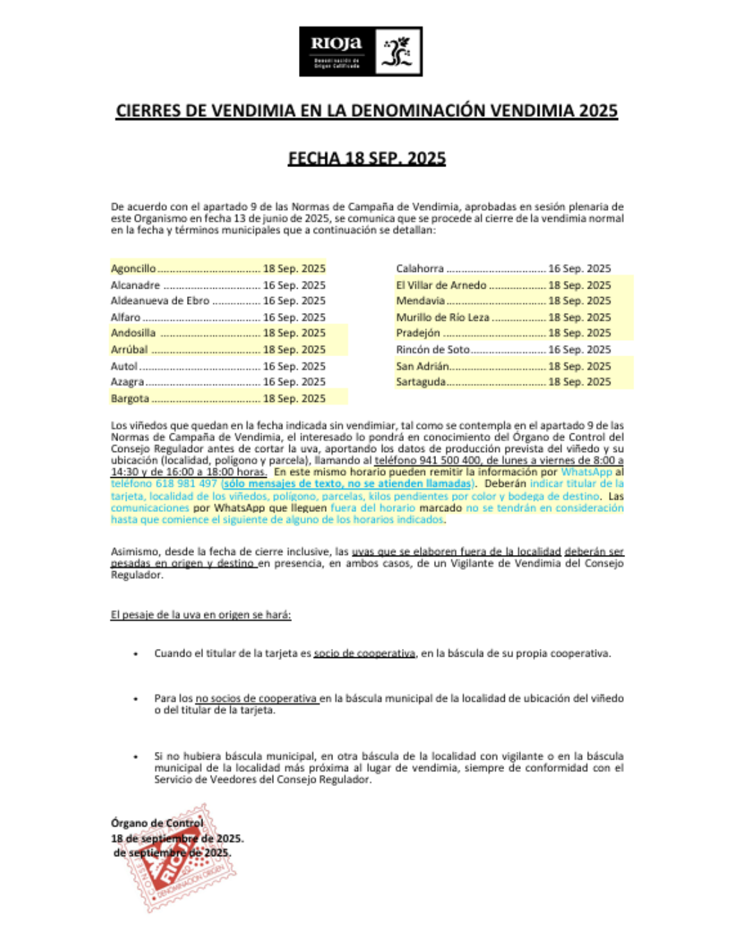 El Consejo Regulador ha fijado el 18 de septiembre de 2025 como fecha de cierre de la vendimia normal en varios términos municipales de la Denominación Rioja. Entre ellos se encuentran: Agoncillo, Andosilla, Arrúbal, Bargota, Calahorra, Aldeanueva de Ebro, Alfaro, Autol, Azagra, Mendavia, Murillo de Río Leza, Pradejón, Rincón de Soto, San Adrián, Sartaguda y otros.