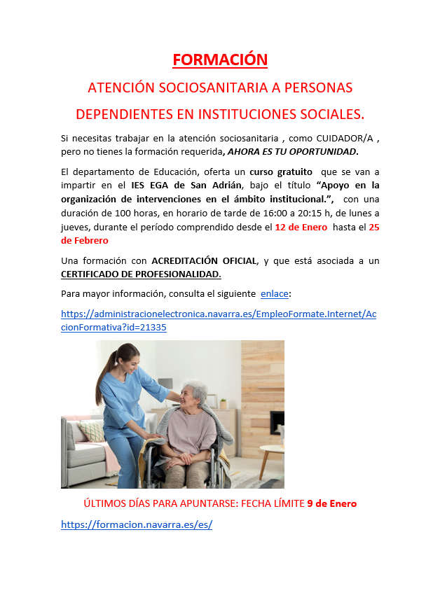 Os informamos de algunos de los cursos de Certificados de Profesionalidad que van a comenzar a partir del mes de enero en el IES EGA de San Adrián, dentro de la oferta de formación para el empleo del Gobierno de Navarra.
