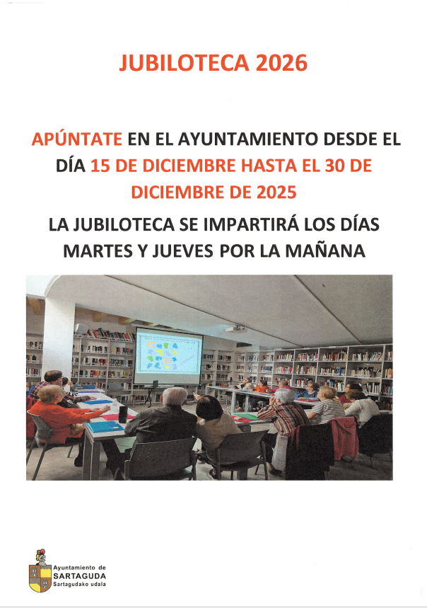 El Ayuntamiento de Sartaguda informa de que el periodo de inscripción para la Jubiloteca 2026 estará abierto desde el 15 de diciembre hasta el 30 de diciembre de 2025. Las inscripciones deberán realizarse presencialmente en las oficinas municipales dentro del plazo establecido.