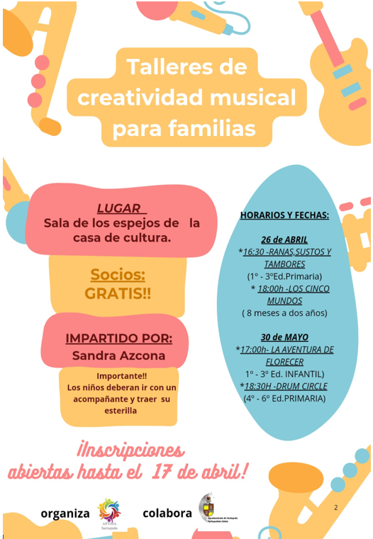 Abiertas las inscripciones para los talleres de creatividad musical para familias, impartidos por Sandra Azcona en la Sala de los Espejos de la Casa de Cultura.